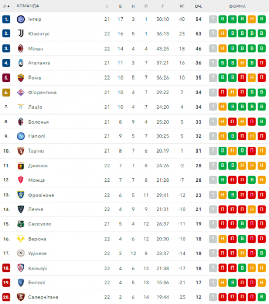 Расписание матчей 22-го и 23-го туров чемпионата Италии по футболу